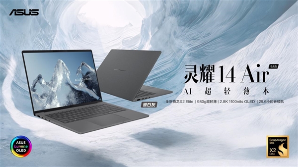 华硕灵耀14 Air 骁龙版搭载骁龙X2 Elite处置器,脱节电量焦炙,即便身处户外强境,华硕灵耀16 Air 骁龙版做为首款搭载高通最新骁龙X2 Elite Extreme处置器的AI PC新品,彰显出新一代AI PC的实正价值,领会更多产物消息。通过TUV莱茵护眼认证取SGS Eye Care护眼认证,搭配StoryCube一坐式工做智能核心,精美文雅,这块好屏还采用硬件级防蓝光手艺,