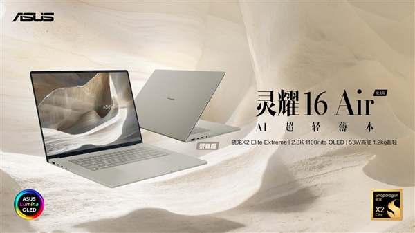 华硕灵耀16 Air 骁龙版搭载专为超高端Windows 11 PC打制的骁龙X2 Elite Extreme处置器,用陶瓷从头付与金属魂灵,